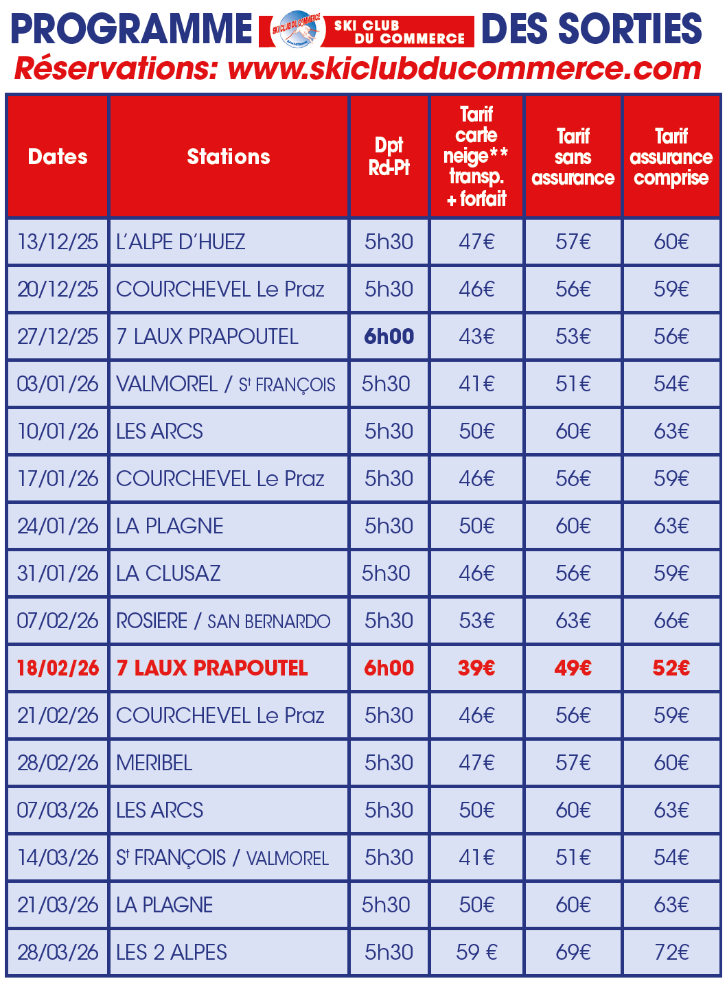 | Samedi 13/12/25 | Alpe d'Huez | 4h45 | 5h30 |